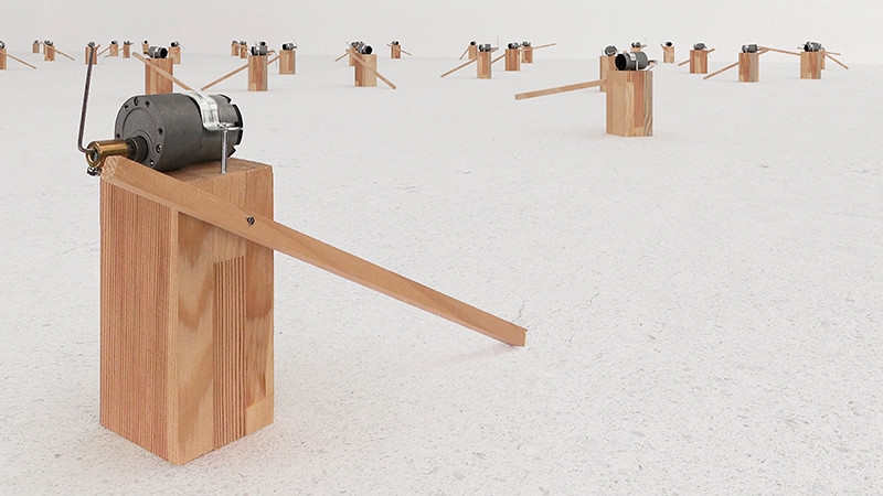 Zimoun是一个大型的声音互动艺术项目。艺术家旨在使用简单的功能组件,通过直流电机使其运动、摩擦、相互碰撞而发出声音,并通过数量上的排列组合从而形成庞大的声音景象,来让观众身临其境去体会这种周而复始的声音景象。艺术家皆在探索制备系统的机械节奏和流动,他的装置作品将司空见惯的工业对象。通过简单功能材料进行了强迫性的显示,这些作品表达了现代主义的有序模式和生活的混沌力量之间的张力。带着情感的深度,自然现象的声哼,在zimoun的极简主义建筑对自然现象的声哼地回荡。